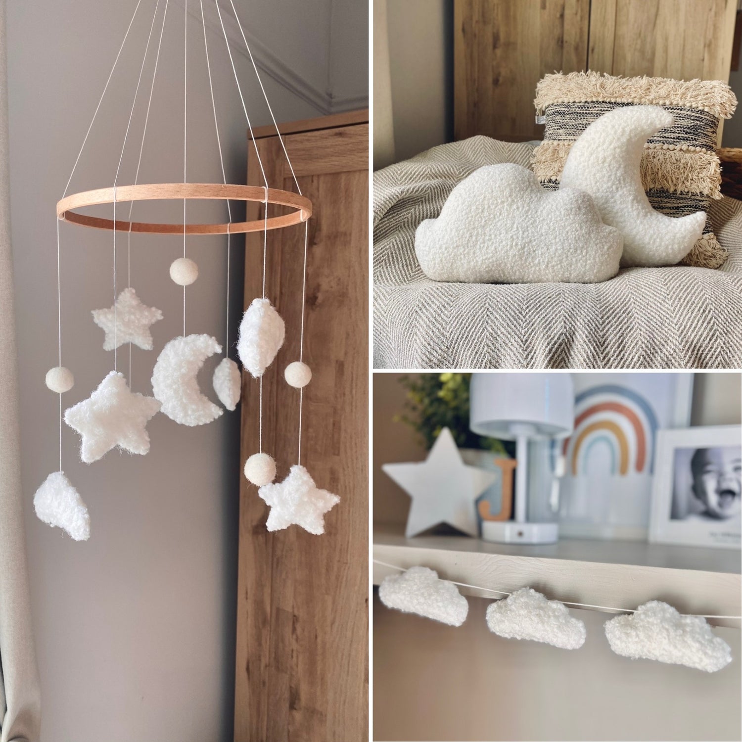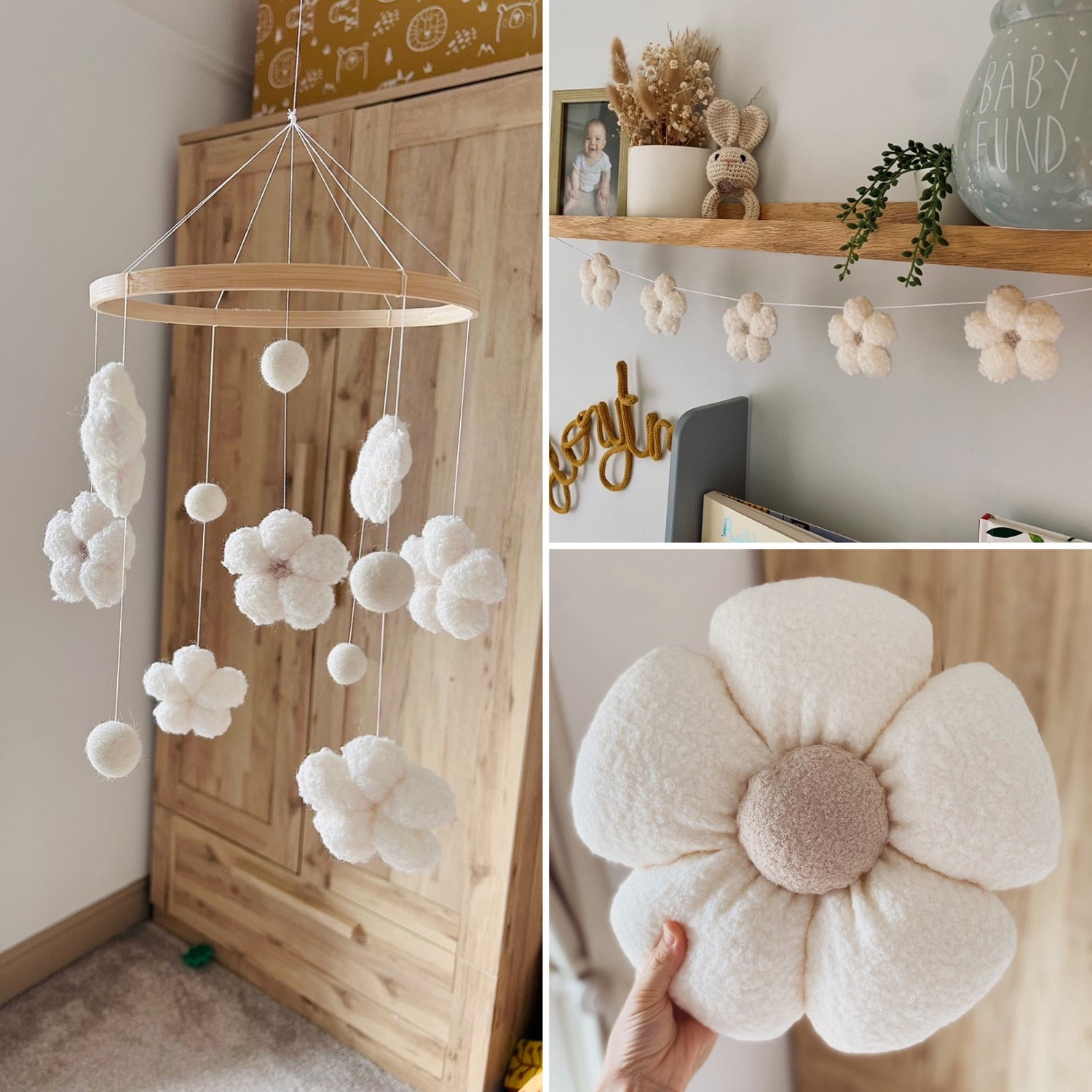 Soft blooms that never fade, brighten your space with our flower collection. Matching pillow to cot mobile and bunting, the cherry on top to your nursery décor. This range is also available in pink.