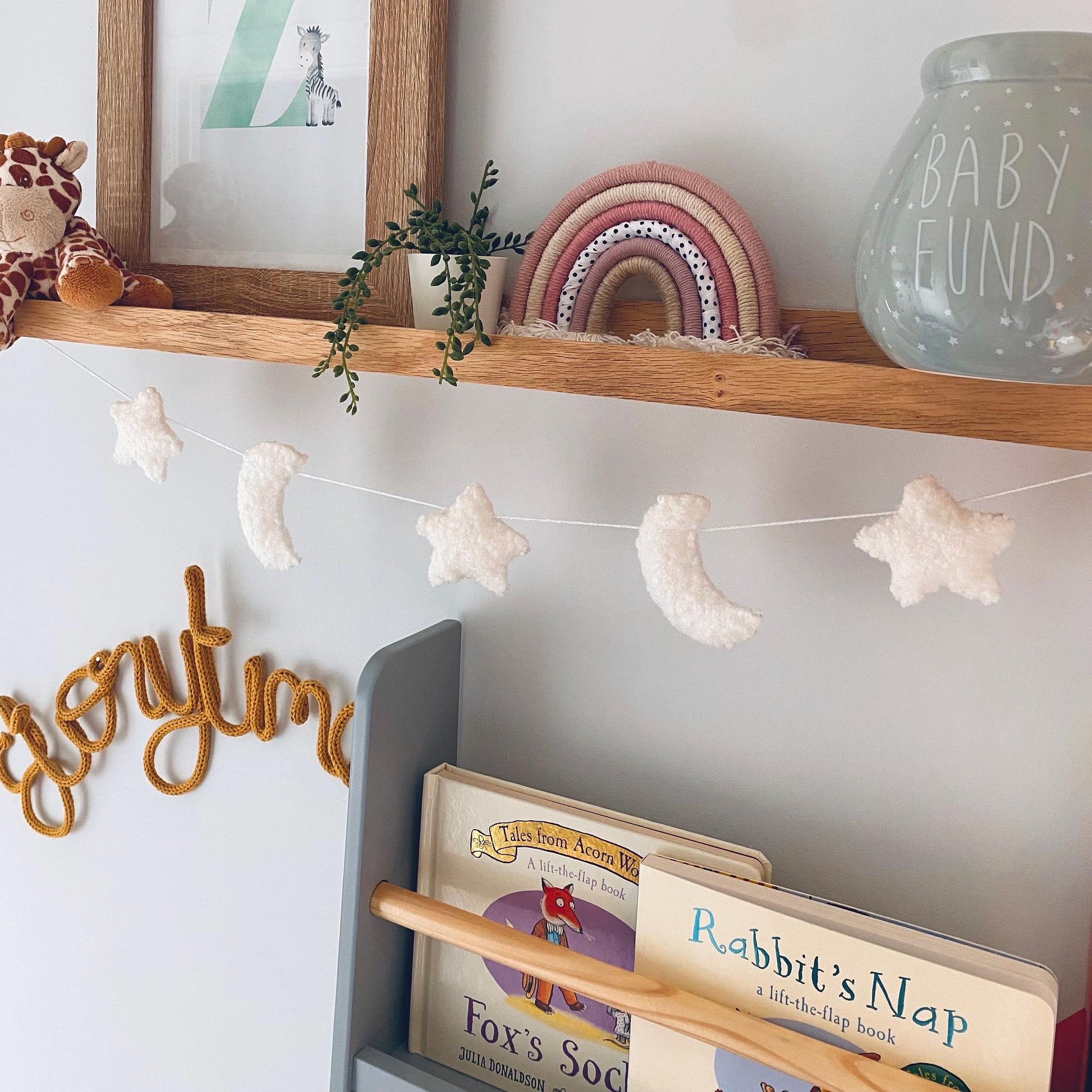 Create a soft and dreamy atmosphere in your little one’s space with our moon and star garland, crafted from bouclé fabric in a neutral tone. This nursery wall hanging adds a touch of texture to baby rooms, kids’ bedrooms, or playrooms — making it a charming and versatile décor piece.