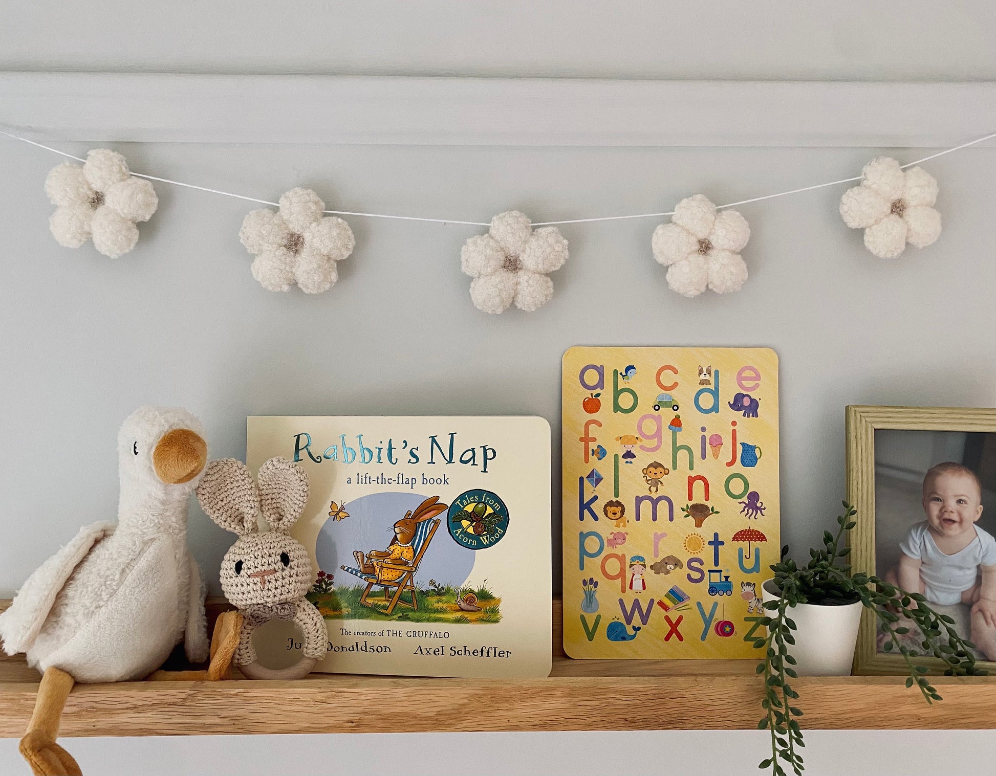 Create a soft and gentle atmosphere in your little one’s space with our flower garland, crafted from bouclé fabric in a neutral tone. This nursery wall hanging adds a touch of texture to baby rooms, kids’ bedrooms, or playrooms — making it a charming and versatile décor piece.
