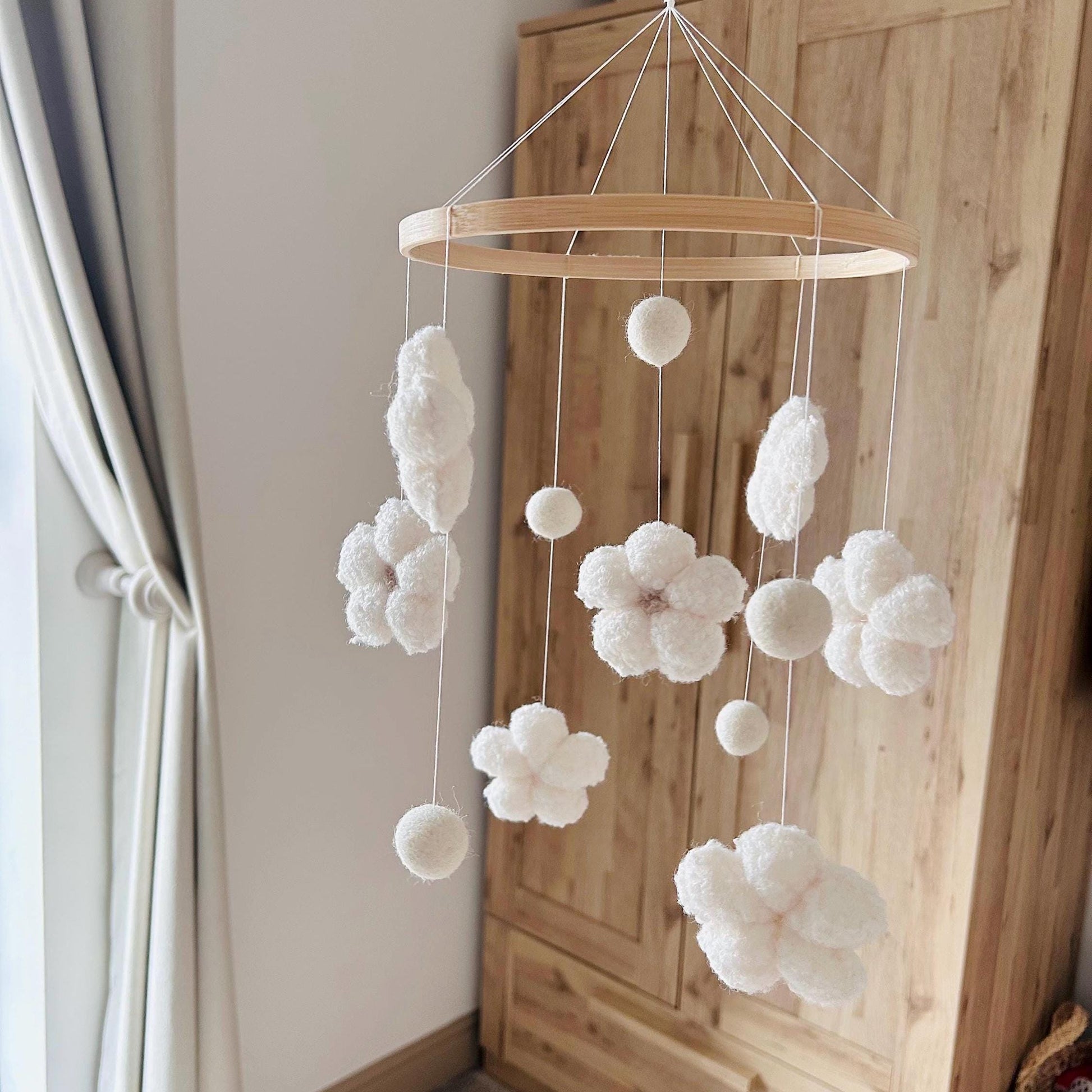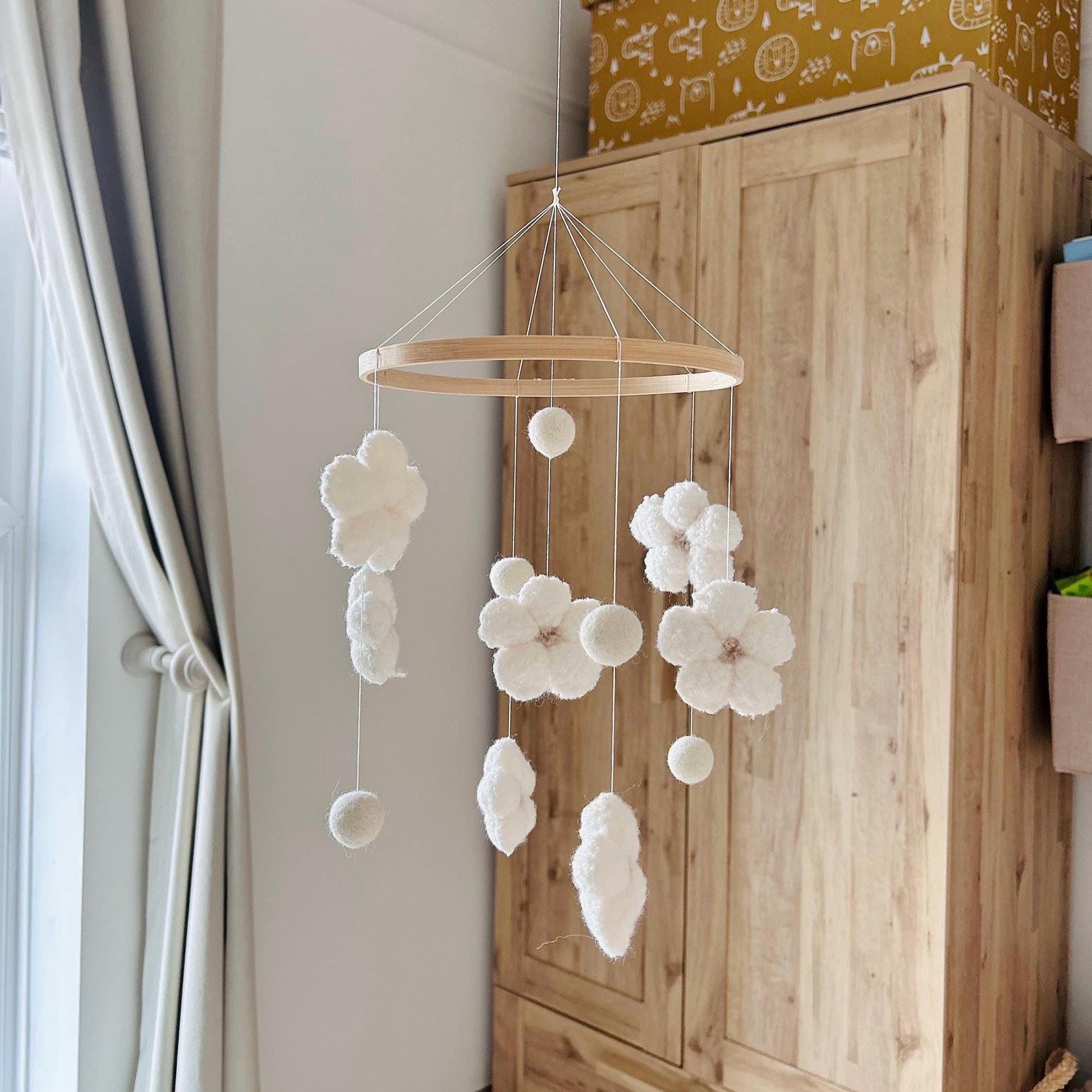 Crafted on a natural 8-inch bamboo hoop, the mobile is the ideal size for hanging above your baby’s cot or crib. It includes 7 flowers and 5 felt balls made from soft, bouclé fabric that adds gentle texture and charm to your nursery décor.